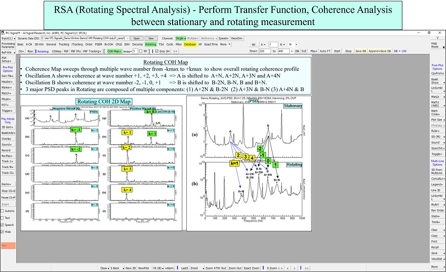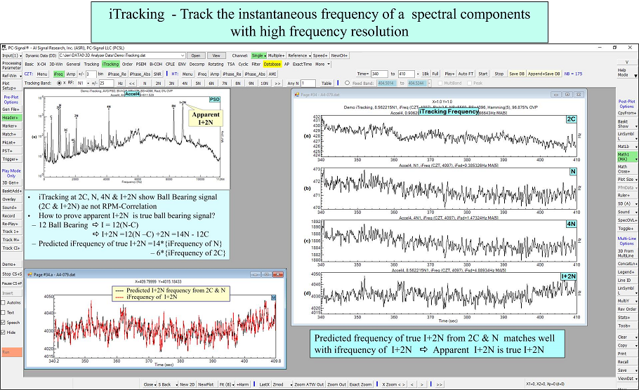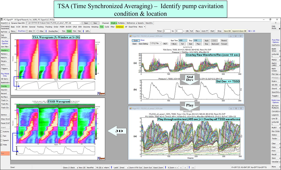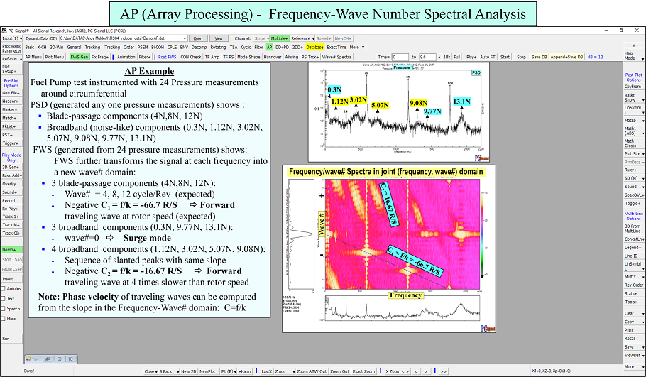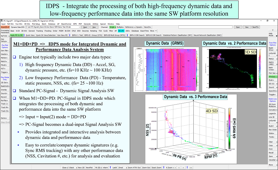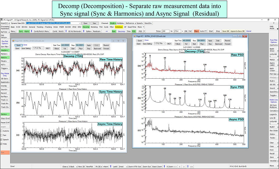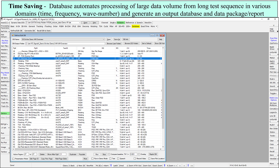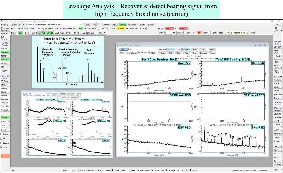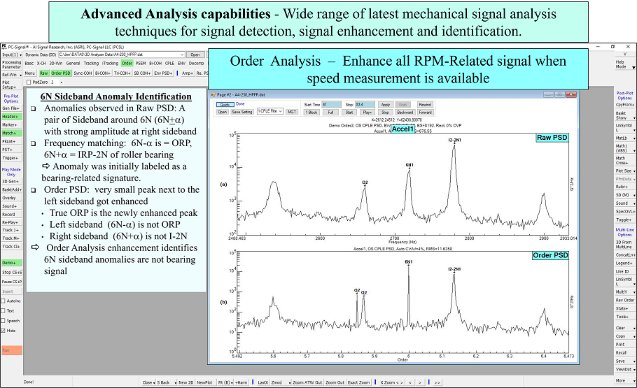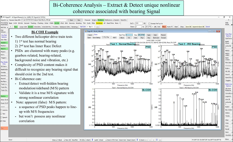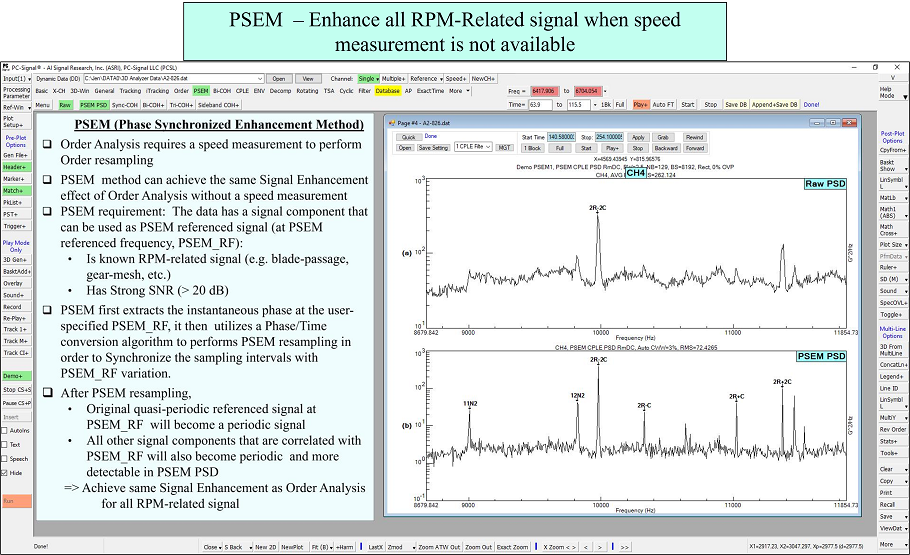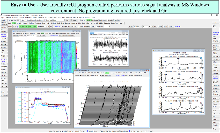 PC-SIGNAL® is a dynamic signal analysis software package for vibration analysis/diagnostics of rotating machinery. It is a commercial software product that comprises a number of algorithms and procedures that were developed for NASA SBIR Phase II and Phase III programs. These advanced signature analysis techniques were developed for rocket engine/machinery fault detection and diagnosis. PC-SIGNAL was created to transfer NASA-developed technology to the industry. The software package is designed to be highly user-friendly and makes dynamic data analysis with either a large volume of data or extensive data analysis requirements a simple task. The analysis capabilities of PC-SIGNAL include a wide range of signal waveform and spectral analysis techniques. These include new processing capabilities for signal detection, signal enhancement, and source identification. Developed for use under the MS Windows environment, PC-SIGNAL provides powerful visualization for studying the signal properties in two-dimensional or three-dimensional displays in the time domain, frequency domain, or joint time-frequency domain. For a large and repeated data processing requirement, PC-SIGNAL can automate the task with an easy-to-use Database module. PC-SIGNAL provides various output formats for report and presentation (ASCII, Excel file, PPT file, or electronic copy). These capabilities do not require any programming experience; with a few simple clicks and checks, users can start analyzing data on a PC. PC-SIGNAL provides a cost-effective solution for many engineering applications. All that is required is your PC computer plus PC-SIGNAL.